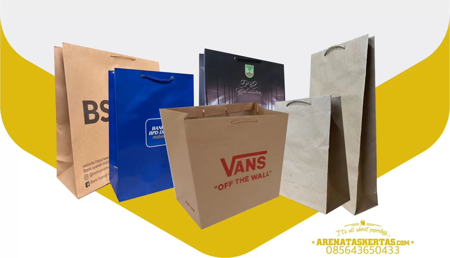 1. Tas Kertas Kraft – Tas kertas kraft adalah tas kertas yang terbuat dari kertas kraft yang kuat dan tahan lama. Ini adalah pilihan yang populer untuk berbagai keperluan, termasuk pemasaran, promosi, dan pengiriman produk. Terdapat 2jenis kertas kraft Kertas Kraft coklat adalah kertas yang permukaannya berwara coklat di kedua sisinya. Kertas kraft putih adalah kertas yang permukaanya berwarna putih di kedua sisinya.